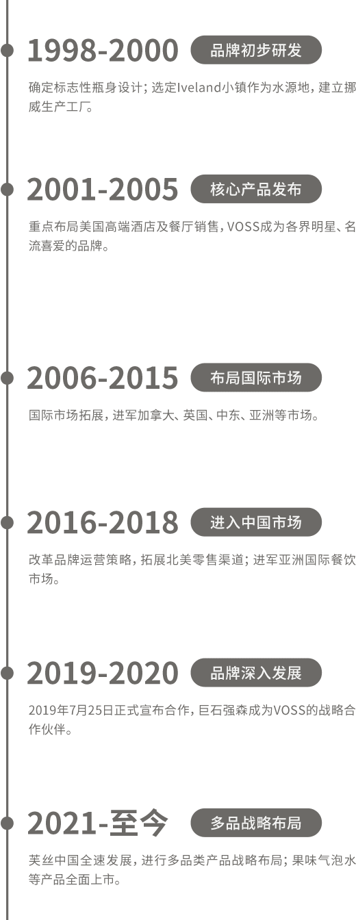 VOSS始于1998年,两个追求卓越的年轻人希望将最顶级的瓶装饮用水带给消费者。历经严格筛选,VOSS最终诞生于挪威。